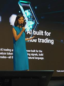 מנכ"לית Bitget גרייסי צ‘ן נושאת את הנאום המרכזי שלה על הבמה המרכזית של MYBW 2025.