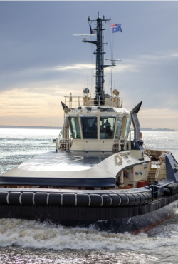 The tug’s patented staple with double-ended hull and in-line propulsion with omni-directional thrust expands the dynamic operating envelope in towage of up to 50%.