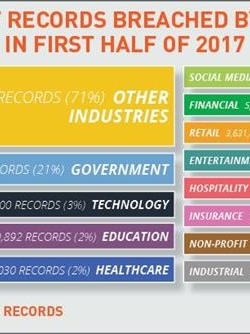 Most of the industries the Breach Level Index tracks had more than a 100% increase in the number of compromised, stolen or lost records. Education witnessed one of the largest increases in breaches up by 103% with an increase of over 4,000% in the number of records. This is the result of a malicious insider attack compromising millions of records from one of China‘s largest comprehensive private educational companies. Healthcare had a relatively similar amount of breaches compared to the last six months of 2016, but stolen, lost or compromised records increased 423%. The U.K‘s National Health Service was one of the top five breaches in the first half with over 26 million compromised records. Financial services, government and entertainment were also industries that experienced a significant jump in the number of breached records, with entertainment breach incidents increasing 220% in the first six months of 2017.